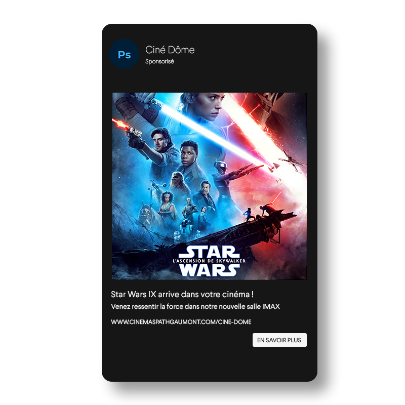 Face au contexte géographique de l’opération et à la cible, nous avons opté pour un dispositif SMA avec Facebook Ads ciblant les fans de Star Wars et les parents susceptibles de venir au cinéma avec leurs enfants.