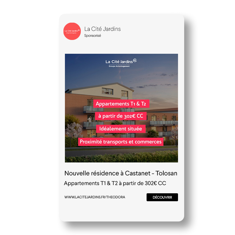 Pour mettre toute la puissance des réseaux sociaux au service de notre partenaire, nous avons également proposé à La Cité Jardins de promouvoir certaines opérations de location d’appartements grâce aux Social Media Ads et plus particulièrement via Facebook Ads. Nous avons alors travaillé des campagnes de publicités digitales locales en ciblant précisément la tranche d’âge visée par le logement.